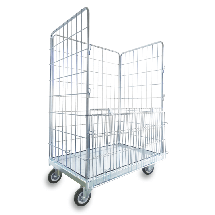 Carro de gran capacidad especialmente pensado para la recogida y transporte de cartones, plásticos, telas… con puerta frontal abatible que facilita la carga y descarga de los elementos transportados.